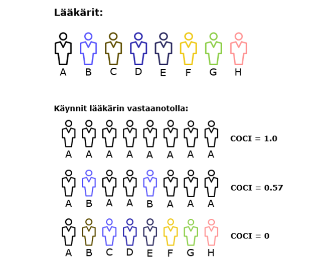 Mietin pitkään tätä blogia kirjoittaessa, minkälaisen esimerkin tuon tukeakseni pienoista vastarintaani mittareita kohtaan. Päätin lopulta spekuloida valtamediassa hyvinkin ajankohtaista teemaa, eli hoidon jatkuvuutta ja sen mittaamista. Hoidon jatkuvuudella tarkoitetaan yksinkertaisuudessaan sitä, tapaako asiakas terveyspalveluissa yleensä saman tai samat ammattilaiset vai onko vastaanottava henkilö useimmiten eri. Hyvällä jatkuvuudella on osoitetusti vahva tieteellinen näyttö potilaan (mm. terveyshyödyt, kuolleisuus, potilastyytyväisyys), terveydenhuollon ammattilaisen (työviihtyvyys ja -tyytyväisyys) ja SOTE-järjestelmän (kustannukset) kannalta. Hoidon jatkuvuutta mitataan muun muassa COC-indeksillä. Indeksi antaa lukuarvon 0–1 välillä riippuen siitä, kuinka monta lääkäriä asiakas tapaa kiireettömillä vastaanottokäynneillään (kuva). Indeksi on nostettu usealla hyvinvointialueella strategiseksi seurattavaksi.